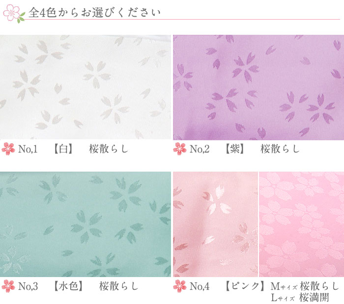 二部式襦袢は、肌襦袢と裾除けが別々に分かれたタイプの和装下着です サイズ表 半襦袢 裾よけ 身丈 裄 袖丈 裾廻り 丈 Mサイズ 60cm 64cm 49cm 135cm 95cm Lサイズ 64cm 65cm 49cm 150cm 95cm パステルカラーの色がキレイで生地の桜柄もかわいらしく、 裾から見えても美しいのでさりげないおしゃれを楽しめます♪