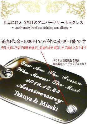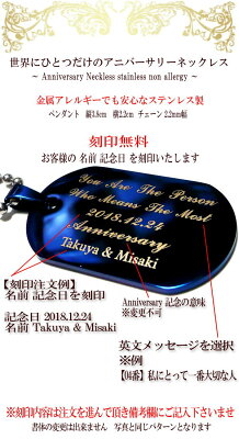 ■世界にひとつだけのアニバーサリーネックレス ■1個 単品売り ■刻印イメージ 定型メッセージ【変更不可】 ※下記の英文メッセージ集から選択下さい 2018.12.24 【記念日が入ります】 Anniversary 【記念日の意味です変更不可】 Takuya & Misaki 【名前が入ります】 ■刻印内容は注文画面を進んで頂き 備考欄にご記入下さい 【例】 2018.12.24 Takuya & Misaki ※『刻印内容を書き忘れた』 場合は当店へご連絡ください ※書体の変更は出来ません 写真と同じとなります ■素材 金属アレルギーでも安心なステンレス製 ステンレスプレート : 縦3.8cm 横2.2cm ステンレスチェーン : 60cm ※到着後にハサミでカットし40cm 45cm 50cm 60cm など調整可能です ■追加代金【+1000円/1個】でジルコニア【石付き】もご用意出来ます 約4mmの大きなジルコニアが輝きを放ちます ※注文後に追加代金がプラスされた金額のご請求となります ------------------------------------- ※メッセージ番号を覚えておくと注文時に便利です ■メッセージ一覧 【01】Forever Love 【永遠の愛】 【04】You Are The Person Who Means The Most 【私にとって一番大切な人】 【05】The Only One PersonIn The World Who I Was Born To Love Forever 【この世界で一人、私が愛する運命の恋人】 【07】No Matter The Distance Our Hearts Are Entwined 【どんなに離れていても心はつながっている】 【11】Now and forever I will love you 【今もこれからもずっと愛している】 【32】I hope you will have a great year.【素敵な年でありますように】 【36】I send my special love to you.【特別な愛をあなたに送ります】 【37】You have been the only one for me.【私にとって、あなたは、ずっと特別です。